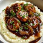 - Add Gravy and Garnishes: Ladle onion gravy over the sausages and mash. Garnish with chopped fresh parsley and crispy fried onions if desired.