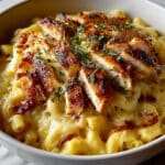 This BBQ Chicken Mac and Cheese is a rich and comforting casserole combining creamy, cheesy macaroni with tender BBQ-coated chicken. Layers of gooey cheddar, Monterey Jack, and Gruyere cheese mingle perfectly with smoky spices and tangy barbecue sauce, then baked to bubbly golden perfection. Finished with fresh green onions, crispy bacon, and cilantro, it’s a crowd-pleasing dish perfect for family dinners or game day celebrations.