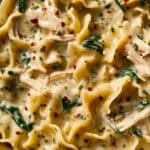 This close-up image shows creamy pasta with ruffled egg noodles mixed with shredded white chicken pieces and wilted dark green spinach throughout. The sauce is thick, smooth, and light beige, coating every part of the pasta and chicken evenly, with small bits of green herbs and red chili flakes sprinkled on top for a touch of color and texture. The overall look is rich and comforting, with the noodles curling gently and layering naturally within the creamy sauce. photo taken with an iphone --ar 4:5 --v 7