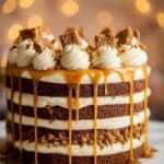 A three-layer cake with each layer made of dark brown sponge and thick light beige cream between the layers, with pieces of crumbly cookie mixed into the middle cream layer and also placed on top. The top of the cake has dollops of the same light beige cream evenly spaced around the edge, each topped with pieces of crumbly cookie. A glossy golden caramel sauce drips down the sides from the top layer, creating a rich and shiny effect. The cake is set against a soft blurred background with warm bokeh lights, on a white marbled surface. Photo taken with an iphone --ar 4:5 --v 7