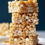 A gooey, no-bake snack that combines the classic crispness of Rice Krispies cereal with rich caramel sauce and melted marshmallows, creating sweet, sticky treats perfect for any occasion.