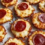 These Pizza Chips are a quick and delicious low-moisture mozzarella cheese snack topped with mini pepperoni and Italian seasoning, baked to golden perfection. Perfect for serving with marinara, alfredo, or ranch dipping sauces, these crispy chips are ideal for game day, parties, or a savory snack anytime.