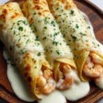 The image shows three rolled crepes filled with shrimp, arranged side by side on a round wooden board. Each crepe is golden brown and covered with a thick layer of melted white cheese sauce, slightly browned on top with small bits of green herbs sprinkled over it. The creamy white sauce is spilling out from the ends, creating a smooth and glossy texture contrasting with the soft crepe and shrimp inside. The wooden board sits on a white marbled surface. photo taken with an iphone --ar 4:5 --v 7