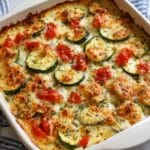 This Chicken Zucchini Bake is a simple and flavorful one-dish meal perfect for a healthy dinner. Tender, seasoned chicken breasts are baked alongside fresh zucchini slices and topped with gooey melted mozzarella cheese and Italian herbs for a delicious, low-carb meal that’s easy to prepare and sure to please the whole family.