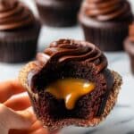 11. Add Caramel Surprise: Spoon a small dollop of caramel sauce into the frosting nest. Let frosting set slightly so caramel doesn’t spill. Serve and enjoy your decadent chocolate caramel cupcakes!