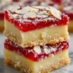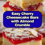 These cheesecake bars combine a buttery sugar cookie crust with a creamy cheesecake layer and a sweet cherry topping. Finished with a crunchy almond crumble, they make a delightful treat for any occasion.