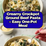 This Comforting Crockpot Ground Beef Pasta is a delicious one-pot meal perfect for busy weeknights. Ground beef is browned and slowly cooked with savory beef broth and Italian seasonings before adding pasta, creamy heavy cream, and parmesan cheese to create a rich, thick sauce. Fresh spinach is stirred in at the end for a nutritious finish. Minimal cleanup and the ‘set it and forget it’ slow cooking method make this recipe an ideal family dinner that satisfies with creamy, hearty flavors.