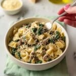 Store leftovers in an airtight container in the refrigerator for up to 4 days. When reheating, add a splash of broth or cream to loosen the sauce and reheat gently on the stovetop or microwave, stirring occasionally. This pasta can also be frozen for up to 2 months, though cream-based sauces may separate slightly when thawed—stirring well during reheating will help restore creaminess.