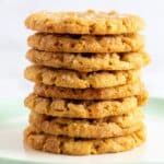 A close-up view of a stack of six golden brown cookies on a white plate with a smooth surface, arranged evenly one on top of another. Each cookie shows a slightly cracked and crumbly texture with small sugar crystals glistening on the surface. The edges are rough and uneven, and the cookies appear thick and soft. The background is simple with a white marbled texture. photo taken with an iphone --ar 4:5 --v 7