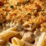 6. Final Bake Uncovered: Return the casserole to the oven uncovered and bake for another 10-15 minutes until the cheese is melted, bubbly, the topping is golden brown, the pasta is tender, and the chicken is fully cooked through.