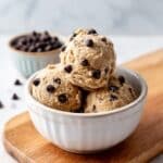 A white ceramic bowl filled with four scoops of light brown cookie dough mixed with chocolate chips, some mini chocolate chips sprinkled on top of the scoops, placed on a wooden board with a blurred white marbled background and a pink jar slightly visible in the background, photo taken with an iphone --ar 4:5 --v 7