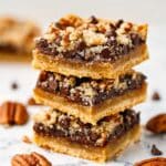 The image shows a stack of three square dessert bars on a white marbled surface. Each bar has three visible layers: a golden brown bottom crust, a middle layer filled with dark brown chocolate chips, and a top layer sprinkled with chopped light brown pecans. The texture of the crust looks firm and crumbly, while the chocolate chips are glossy and slightly melted. The chopped pecans add a rough, crunchy look to the top. The stack is placed near a few loose pecans scattered on the surface. Photo taken with an iphone --ar 4:5 --v 7