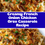 Keywords: French onion casserole, chicken orzo casserole, comfort food, baked pasta dish, caramelized onions, cheesy casserole