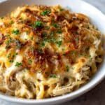 This French Onion Chicken Orzo Casserole combines deeply caramelized onions with tender shredded chicken and creamy orzo pasta, baked to bubbly, golden perfection with mozzarella and Parmesan cheese. The dish delivers rich, comforting flavors inspired by French onion soup, elevated with wholesome ingredients and easy preparation, making it an ideal family meal.