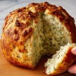 A round, golden-brown bread loaf with a crispy crust sits on a wooden board against a white marbled background. The loaf is split open to show a soft, slightly moist inside with a white and light green mixture of herbs and cheese evenly spread throughout the thick, fluffy layers. The bread’s top has a textured surface with small browned, crunchy bits. A woman's hand is gently pulling a piece away from the loaf, emphasizing the bread’s soft inside and crispy outside contrast. Photo taken with an iphone --ar 4:5 --v 7