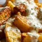 The image shows a close-up of several food pieces that look like small roasted potatoes with a light golden brown color. They are covered with a thick, creamy white sauce with green herbs sprinkled on top, giving a fresh touch. The potatoes have a slightly crispy texture on the outside, and the sauce appears smooth and rich, evenly spread over each piece. The background is a white marbled surface, creating a clean and bright setting. photo taken with an iphone --ar 4:5 --v 7