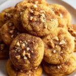 A close-up of a stack of soft cookies on a white plate, each cookie showing a golden brown color with a slightly cracked surface. The cookies are topped with small pieces of chopped nuts and a light dusting of cinnamon or sugar, adding texture and contrast. The cookies are arranged in a slightly messy pile with some cookies fully visible and others partially covered, all placed on a white marbled surface. Photo taken with an iphone --ar 4:5 --v 7