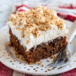 This Gingerbread Poke Cake is a delightful twist on a classic holiday dessert. Moist gingerbread cake is infused with sweetened condensed milk and butterscotch topping, then finished with fluffy whipped cream and crunchy toffee bits for a perfect balance of flavors and textures.