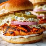 These Grilled Buffalo Chicken Sandwiches offer a deliciously spicy and smoky twist on the classic Buffalo wings, using tender grilled chicken breasts marinated in buffalo sauce and honey. Topped with a refreshing grinder-style slaw and melted cheese on toasted brioche buns, they create a perfect balance of bold flavors and textures, ideal for a quick weeknight meal or summer BBQ gathering.