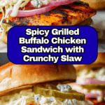Keywords: Buffalo chicken sandwich, grilled chicken, buffalo sauce, grinder slaw, spicy sandwich, brioche bun, summer BBQ, chicken sandwich recipe