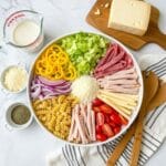 A refreshing and hearty Grinder Pasta Salad featuring rotini pasta, oven roasted turkey, pepperoni, salami, provolone, parmesan, and crisp vegetables, all tossed in a tangy, homemade pepperoncini dressing. Perfect for potlucks, picnics, or a satisfying make-ahead meal.