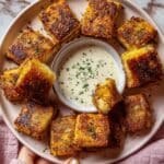 The image shows a white plate on a white marbled surface, filled with golden-brown fried cheese bites that have a crispy texture. The bites are square-shaped and arranged around a small white bowl of creamy white dipping sauce placed in the center of the plate. Each cheese bite has a slightly uneven, crunchy outside with some areas darker than others, and looks soft and melty inside. Small bits of green herbs are sprinkled on the cheese bites and sauce for garnish. A woman's hand is partially visible resting near the plate. photo taken with an iphone --ar 4:5 --v 7