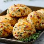 The image shows a close-up of seven round savory biscuits arranged on an old metal baking tray placed on a white marbled surface. Each biscuit has a rough, golden top layer sprinkled with melted orange cheese and small green herb pieces. Mixed into the light beige dough are visible bits of red bacon and green herbs, creating a speckled effect all over the biscuits. A small sprig of fresh green thyme lies in front of the biscuits, adding a fresh look. The background is softly blurred with some green herbs visible. Photo taken with an iphone --ar 4:5 --v 7