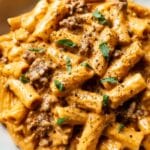 This High Protein Creamy Beef Pasta is a quick and satisfying weeknight dinner that combines tender penne pasta with a flavorful ground beef mixture enriched with Greek yogurt and Parmesan cheese. With Italian seasoning and fresh herbs for garnish, this dish offers a perfect balance of creaminess and savory goodness in under 30 minutes.