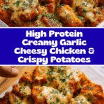 This High Protein Creamy Garlic Cheesy Chicken & Potatoes dish combines tender chicken, crispy potatoes, and a luscious garlic parmesan sauce. It’s a flavorful, comforting meal that’s perfect for a satisfying dinner any night of the week.