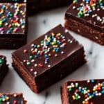 Delicious homemade Cosmic Brownies featuring a rich, fudgy chocolate base topped with a smooth chocolate ganache and colorful rainbow sprinkles, perfect for a decadent treat or celebration.