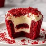 A small red velvet cupcake with a swirl of white cream cheese frosting inside, showing a layered pattern: a thick red outer cake layer with a moist, crumbly texture, a creamy white middle layer, and a red velvet center swirl above the cream, all topped with red crumbs on the surface. It is placed on a white plate with scattered red crumbs around it, set on a white marbled surface. Photo taken with an iphone --ar 4:5 --v 7