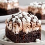 This Hot Chocolate Poke Cake is a delightful and indulgent dessert perfect for cozy gatherings. A moist chocolate cake is poked with holes and filled with marshmallow creme, hot fudge sauce, and whipped topping mixed with hot chocolate mix. Topped with mini marshmallows and chocolate chips, it creates a rich and festive treat that tastes like a warm cup of hot cocoa in cake form.