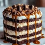 Decadent chocolate caramel toffee crunch cake featuring layers of moist chocolate cake, rich caramel sauce, whipped cream, and crunchy toffee bits. This crowd-pleasing dessert combines smooth textures and delightful crunch, perfect for celebrations or indulgent treats.