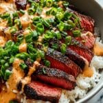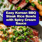 Keywords: Korean BBQ, Steak Rice Bowls, Spicy Cream Sauce, Gochujang, Kimchi, Grilled Steak, Asian Fusion, Quick Dinner