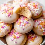 A pile of small round cookies with one layer of smooth white icing on top, each cookie decorated with a small cluster of colorful sprinkles in pink, blue, yellow, and orange, placed close together on a white marbled surface; one cookie is bitten showing a soft, dense, light golden inside texture; the overall color palette is soft with pastel icing and bright sprinkles scattered on the right side and center of each cookie, photo taken with an iphone --ar 4:5 --v 7