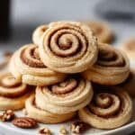 The image shows a stack of cinnamon roll cookies arranged on a white plate sitting on a white marbled surface. Each cinnamon roll has several spiral layers of dough with a cinnamon brown filling visible in the swirls, and the outer dough layers are a light golden brown color with a slightly textured, baked appearance. The cinnamon rolls are stacked unevenly, creating depth and making the texture of each spiral clear. There are some small crumbs and a few pecans scattered around the plate, adding natural detail. Photo taken with an iphone --ar 4:5 --v 7