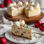 A delightful no-bake sugar cookie cheesecake featuring a crunchy sugar cookie crust, a creamy vanilla-scented cream cheese filling, and a smooth white chocolate topping decorated with festive holiday sprinkles. Perfect for an easy yet elegant dessert that doesn’t require an oven.