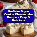 This No-Bake Sugar Cookie Cheesecake is a delightful treat that combines the buttery crunch of sugar cookie crust with a creamy, vanilla-infused cheesecake filling. Topped with silky white chocolate ganache and festive sprinkles, it’s perfect for any holiday or special occasion without heating up your kitchen.