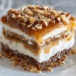 This No-Bake Turtle Lasagna Dessert is a decadent layered treat combining crispy graham crackers, creamy chocolate pudding, smooth cream cheese, rich caramel sauce, and crunchy pecans, all topped with a fluffy whipped topping. Perfect for those looking for an indulgent, easy-to-make dessert that requires no baking and is ready after chilling.