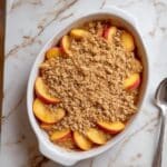 An oval white baking dish filled with a layer of sliced peaches around the edges showing bright orange and red hues, topped with a thick crumbly layer of light brown sugar and cinnamon crumble that has a rough, chunky texture, all set on a white marbled surface. A silver spoon lies next to the dish. Photo taken with an iphone --ar 4:5 --v 7