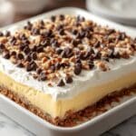 The Perfect Potluck Dessert is a rich, layered treat featuring a buttery yellow cake base, a smooth cream cheese filling, and gooey chocolate chips topped with a drizzle of heavy cream and optional pecans. This simple yet sophisticated dessert is easy to make, serves a crowd, and is perfect for sharing at any gathering.
