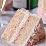 Keywords: pink champagne cake, champagne cake recipe, celebration cake, pink cake, layer cake, buttercream frosting, festive desserts