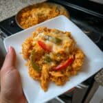 A close-up of a serving of reddish-orange rice mixed with pieces of cooked chicken and strips of green and red bell peppers. The dish is topped with a light, creamy sauce that adds a glossy texture on top. The food sits on a white square plate with a shiny surface, held by a woman's hand at the bottom left corner. In the background, more of the same dish is visible in a dark pan on a stove, resting on a white marbled surface. photo taken with an iphone --ar 4:5 --v 7