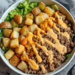 - Assemble the Bowls: In serving bowls, start with a base of crispy air-fried potatoes, then layer with the smashed beef and caramelized onions. Sprinkle the shredded cheese on top so it begins to melt slightly. Drizzle with the prepared Cajun sauce, then add fresh lettuce and crunchy pickles for added texture and freshness. Serve immediately and enjoy!