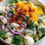- Assemble the Salad: In a large mixing bowl, combine the chopped broccoli, chopped cauliflower, half of the crumbled bacon, Colby Jack cheese cubes, and diced red onion.