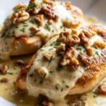 The image shows a close-up of two pieces of cooked chicken breast on a white plate, sitting on a white marbled surface. Each chicken piece is topped with a smooth, creamy sauce that has a light beige color, covering most of the chicken's surface. On top of the sauce, there are small pieces of chopped walnuts that add a rough texture and a golden-brown color. The dish is sprinkled with fresh green herbs, giving a bright contrast to the warm colors of the chicken and sauce. The lighting highlights the juicy texture of the chicken and the glossy sauce. Photo taken with an iphone --ar 4:5 --v 7