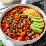 This Turkey Sweet Potato Chili is a hearty, nutritious, and flavorful dish perfect for cozy dinners. Ground turkey pairs with tender sweet potatoes, diced tomatoes, and a blend of spices for a warming chili that’s both satisfying and healthy. Topped with fresh cilantro, cheddar cheese, and creamy avocado slices, this chili brings a balanced mix of textures and tastes that everyone will love.